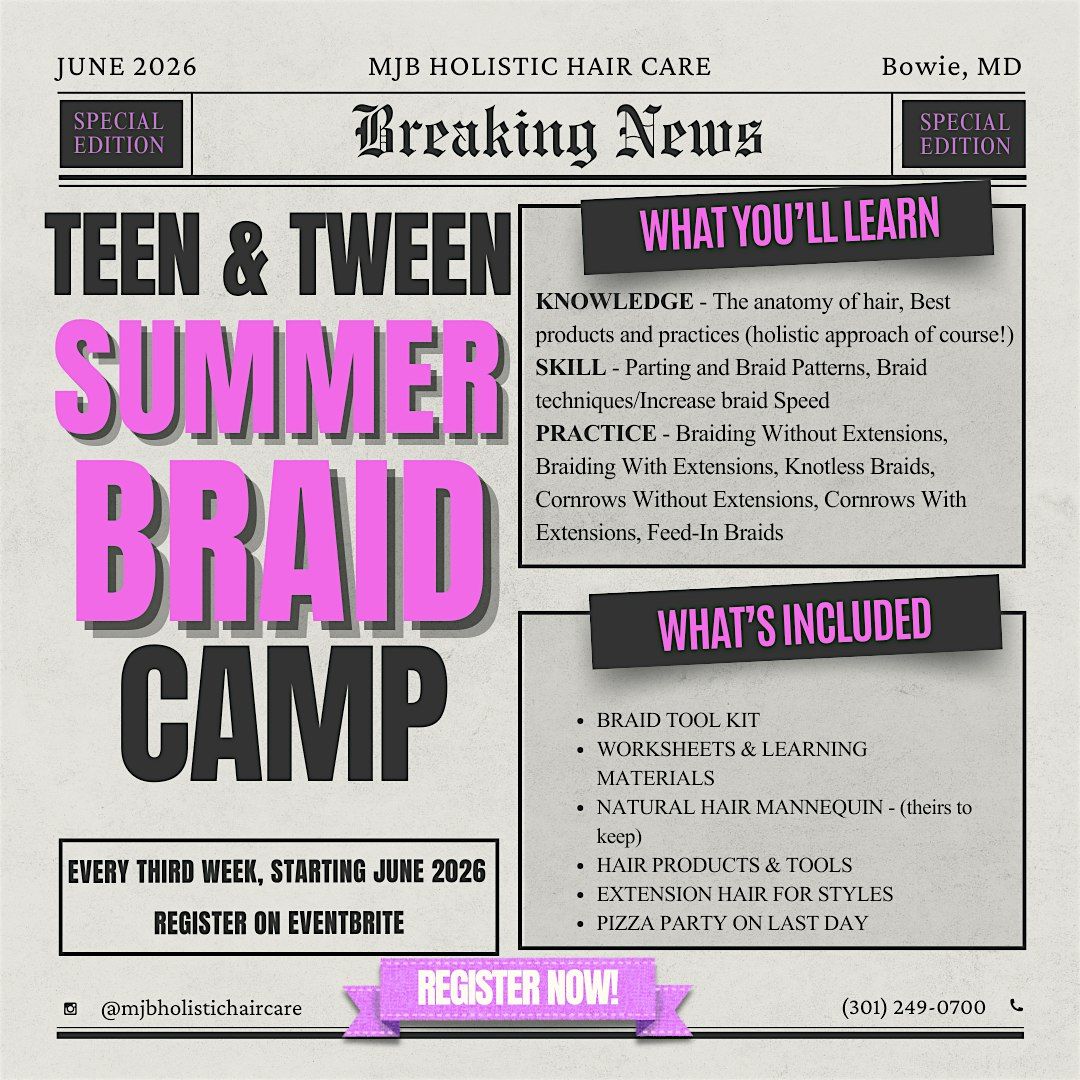 Our mini braid bosses will learn trendy styles, clean parts & pro techniques while having fun, building confidence & making new friends!About this Event