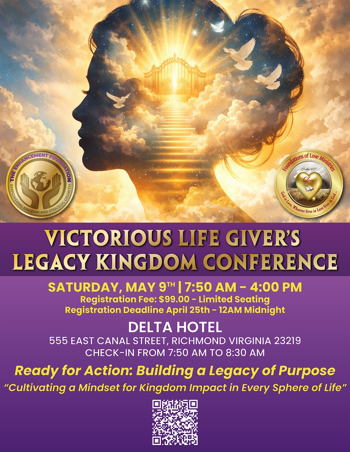 The Victorious Life-giver’s Legacy Kingdom Mindset Conference is a Pre–Mother’s Day gathering hosted by The Enhancement Foundation (TEF) and Foundations of Love Ministries (FOLM), celebrating and empowering mothers, families, and life-givers through faith, fellowship, and Kingdom principles. Held on Saturday, May 9, 2026, at the Delta Hotel in Richmond, Virginia, this full-day conference offers spiritual nourishment through prayer, worship, teaching, panel discussions, impartation, networking, and gospel music.