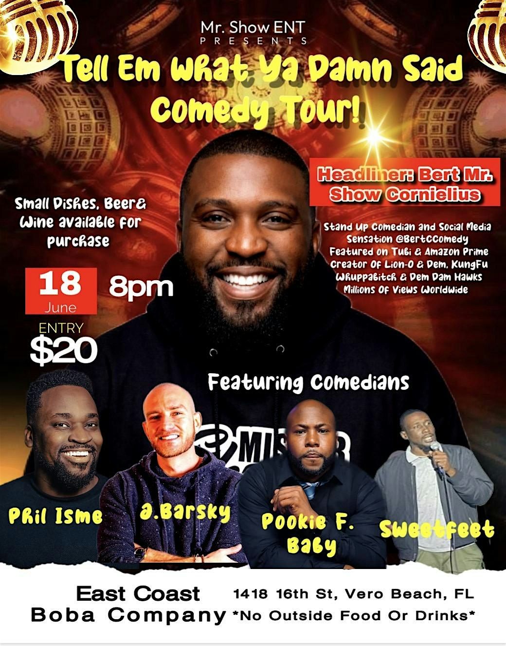 The Tell Em What Ya Damn Said Comedy Tour Stops in Vero Beach! Come out and see the hilarious Bert Mr. Show Cornielius and Friends!