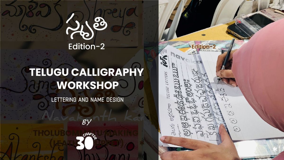 Lettering & Name DesignPresented by స్మృతి (Smruthi) – Edition 2Welcome to a world where తెలుగు లిపి becomes timeless art. This Telugu calligraphy workshop focuses on letter formation, rhythm, and expression. Participants will practice Telugu letters and gradually move towards designing their own names using provided materials.Basic guidance, tools, and creative techniques will be shared, and the final artwork can be taken home.Facilitated by Navakanth Karide, a Telugu calligraphy artist whose work bridges tradition and contemporary expression.