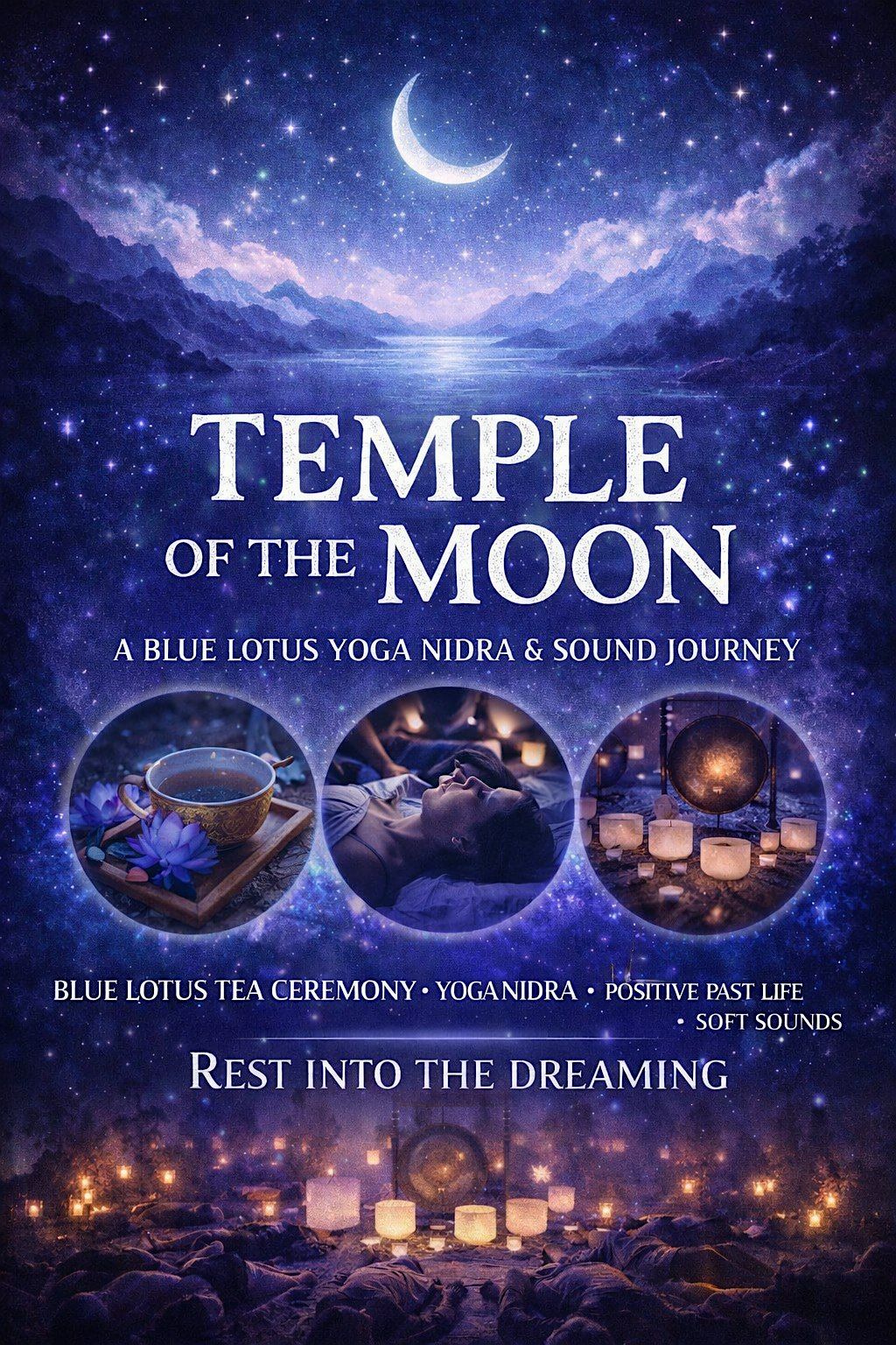 Temple of the Moon is a gentle ceremonial experience combining a blue lotus tea ritual, guided yoga nidra, positive past life regression and soft immersive sounds.