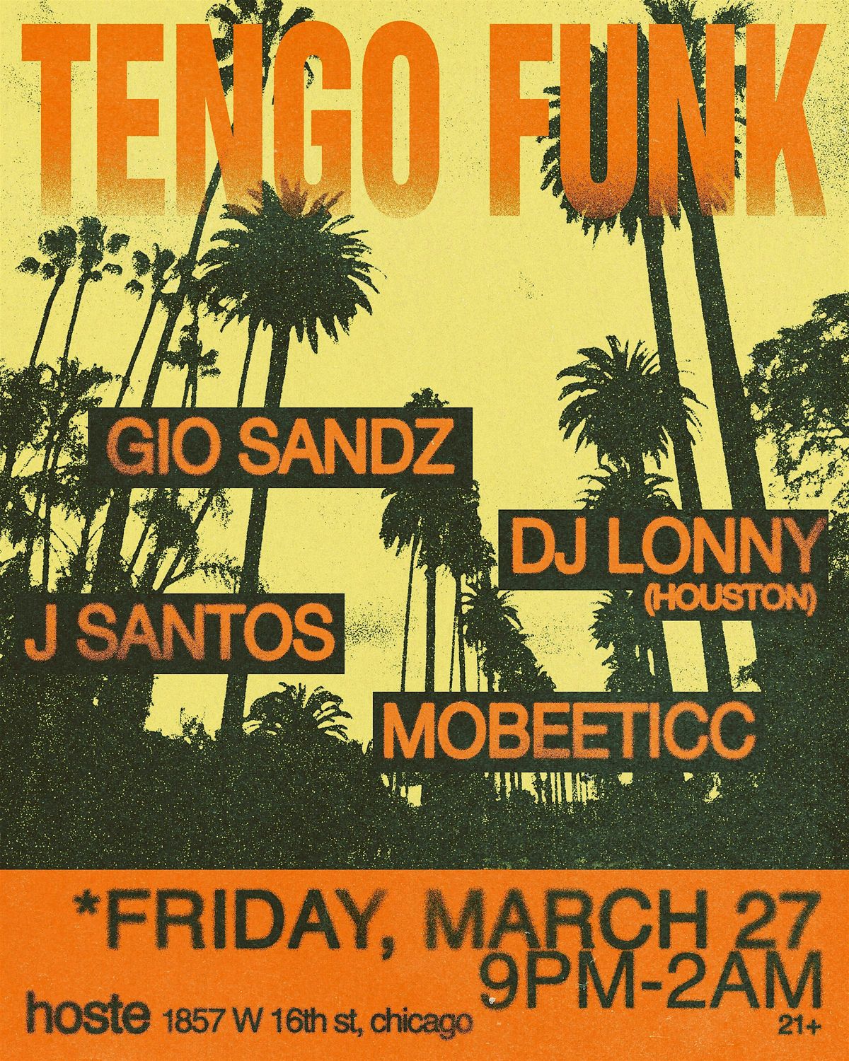 March 27 — Tengo Funk takes over Hoste. Join us for a night of high-energy global club sounds with DJs Gio Sandz, Lonny (Houston) & more