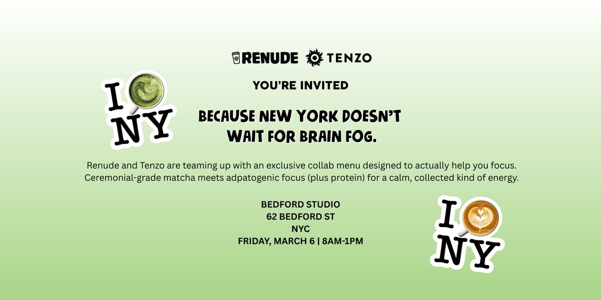 Renude and Tenzo are joining forces for a one morning only pop-up at Bedford Studio, NYC, bringing you an exclusive collab menu of organic ceremonial grade matcha and premium adaptogenic blends. Come for the vibes, stay for the drinks that actually help you focus. Think ceremonial grade matcha meets adaptogenic function (plus protein) for a calm, collected kind of energy that keeps up with the city.
