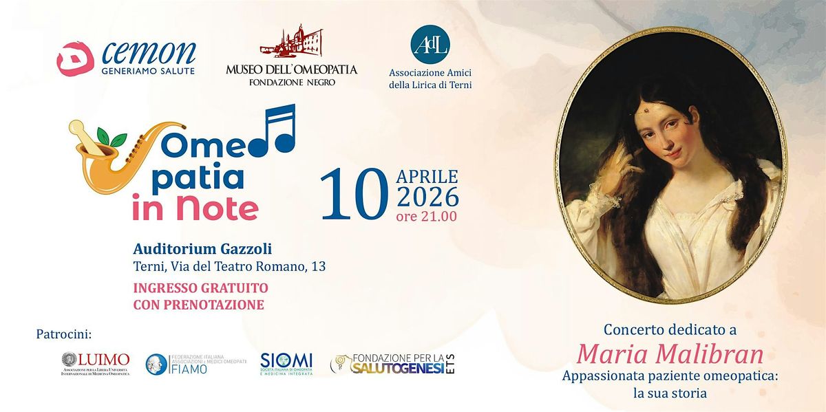 La rassegna Omeopatia in Note (ideata da Francesco Eugenio negro direttore del Museo dell'Omeopatia di Roma - Fondazione Negro e organizzata insieme a CeMON Generiamo Salute) che narra il legame di famosi musicisti con la medicina omeopatica è alla sua seconda edizione questa volta a Terni, grazie alla preziosa collaborazione con l'Associazione Amici dell Lirica della città Umbra. Perchè Terni? Terni ha un alto valore simbolico per l'Omeopatia, infatti in questa città Il Consiglio Nazionale della FNOMCeO, riunito il 18 maggio 2002, ha riconosciuto la medicina omeopatica come ATTO MEDICO, riservandone l'esercizio ai soli medici chirurghi, odontoiatri, veterinari e farmacisti. La decisione fu adottata in risposta alla crescita della domanda sociale di medicine complementari e in linea con le risoluzioni del Parlamento Europeo. Inoltre Terni è sede della FIAMO (Federazione Italiana delle Associazioni e dei Medici Omeopati) importante e rappresentativa associazione del mondo omeopatico italiano, circostanza che ribadisce la centralità di questa città per l'Omeopatia in Italia. L'edizione di quest'anno è dedicata a Maria Malibran (1808-1836) celebre cantante lirica spagnola, una delle più iconiche voci dell'Ottocento, famosa per la sua estensione vocale straordinaria, il temperamento drammatico e la bravura nel belcanto. Protagonista nei teatri di Europa e America in opere di Rossini e Bellini, morì a soli 28 anni a causa di un incidente. Verranno raccontate con la consueta capacità narrativa da Francesco Eugenio Negro le vicende della sua vita che la legavano all'Omeopatia di cui era utilizzatrice convinta. Ogni capitolo della vita della grande artista sarà intervallato da brani operistici del repertorio della Malibran, interpretati dall'affermato soprano Renata Campanella accompagnata dal Maestro Stefano Giaroli al pianoforte. Una serata per gustare buona musica e conoscere come si curavano tanti personaggi famosi. Ogni malattia è un problema musicale, e ogni cura una soluzione musicale.(Novalis)