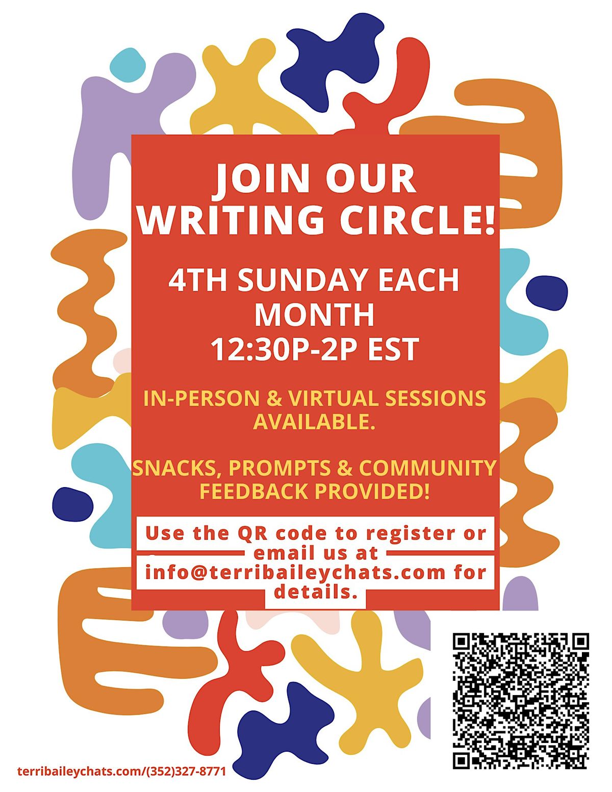 Join me for the 4th Sunday Writing Session. You may work on your own project or use a prompt I will provide. For those attending our in-person sessions, 6 5-minute 1st-come/1st-served feedback slots will be available for signup at the beginning of each group. You read to the group, and we offer feedback. We are unable to offer the feedback session to virtual participants at this time. Virtual participants may stay on and offer feedback in the chat.