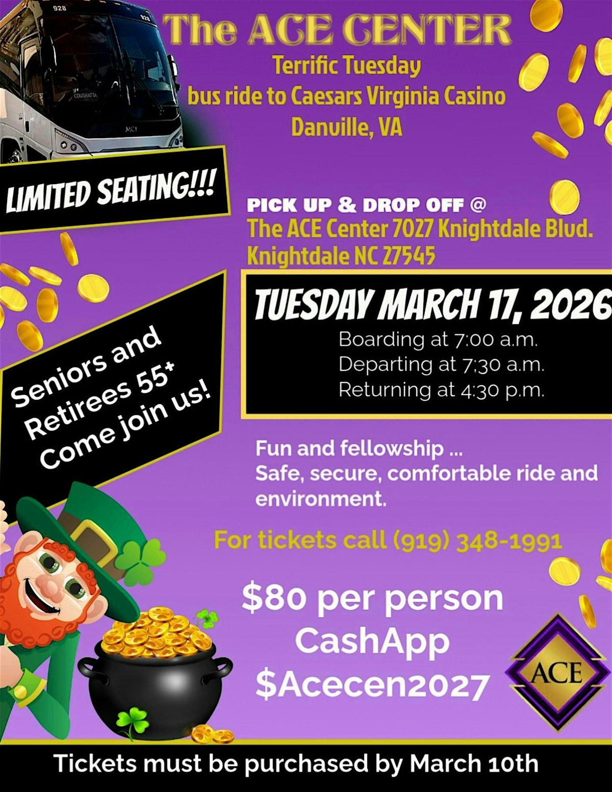 A fun day trip for Seniors, 55+ on St. Patrick's Day to Cesars Casino, Danville Va. Bus leaves at 7:30AM from Knightdale, returns 430PM.