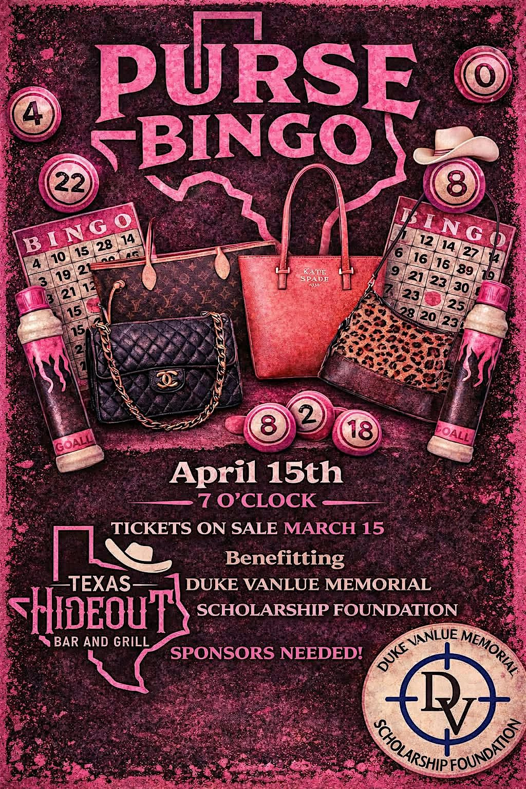 Join us April 15th at 7:00 PM at Texas Hideout Bar & Grill for a fun-filled night of bingo, great prizes, and community support! We’ll be playing for beautiful designer purses while raising money for the Duke VanLue Memorial Scholarship Foundation. Grab your tickets and invite your friends for a night out you won’t want to miss!