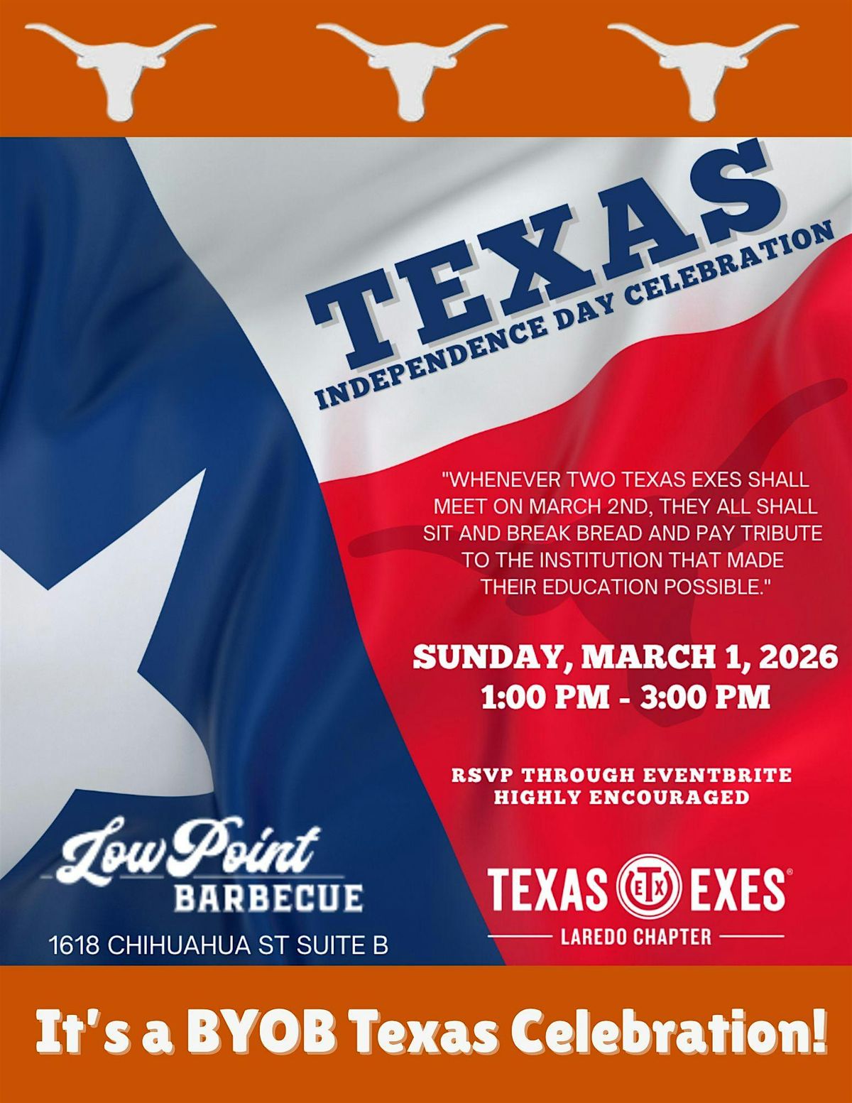Deep in the heart of Texas…Come celebrate Texas Independence Day with your Laredo Texas Exes on Sunday, March 1, 2026! It's a BYOB lunch at LowPoint Barbecue. We hope you’ll join us for a good time with other Laredo Longhorns! See y’all soon! 🤠