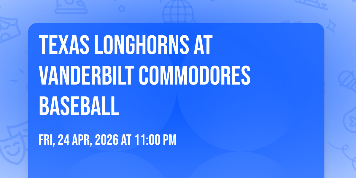 📍 Location: 36.1433, -86.8074🎉 Welcome to Texas Longhorns at Vanderbilt Commodores Baseball, where dreams come alive and possibilities are endless! 🏛️ Join us at Hawkins Field in the heart of Nashville, TN for an event that defies expectations. 📅 On April 26th, 2026 at 05:00 PM, be part of something truly extraordinary as we bring together innovation, entertainment, and pure magic. ✨ Every aspect has been carefully designed to ensure an unforgettable experience for all our guests. Whether you're seeking adventure, inspiration, or simply a break from the ordinary, this event promises to deliver beyond your wildest dreams. 🎊 Prepare for a journey into the extraordinary!