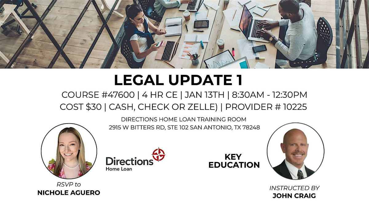 This in-person Legal Update I course provides 4 hours of Texas real estate continuing education (TREC CE credit) for agents and brokers. We’ll cover the latest legal and regulatory updates impacting real estate practice in Texas—plus practical examples so you know exactly how the changes show up in contracts, client conversations, advertising, and daily decision-making.