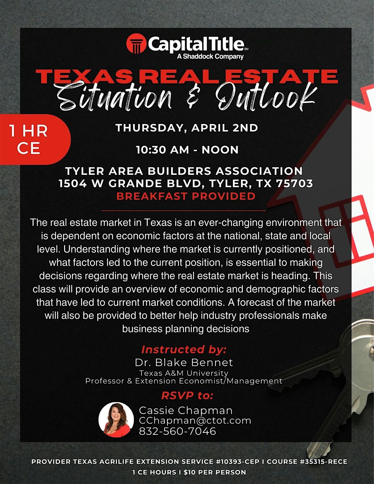 1 HR CE: Texas Real Estate Situation & Outlook – April 2, 10:30AM in Tyler. Breakfast included. Stay ahead of the market!