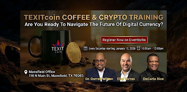 Welcome to the TEXITcoin Coffee & Crypto Training event! Join us at 116 N Main St on January 10, 2026 at 10:00 AM (Central Time) for a morning filled with learning and networking. Whether you're new to the world of cryptocurrency or a seasoned pro, this event is perfect for you. Get ready to sip on some coffee, chat about crypto trends, and gain valuable insights from industry experts. Don't miss out on this opportunity to expand your knowledge and connect with like-minded individuals. See you there!