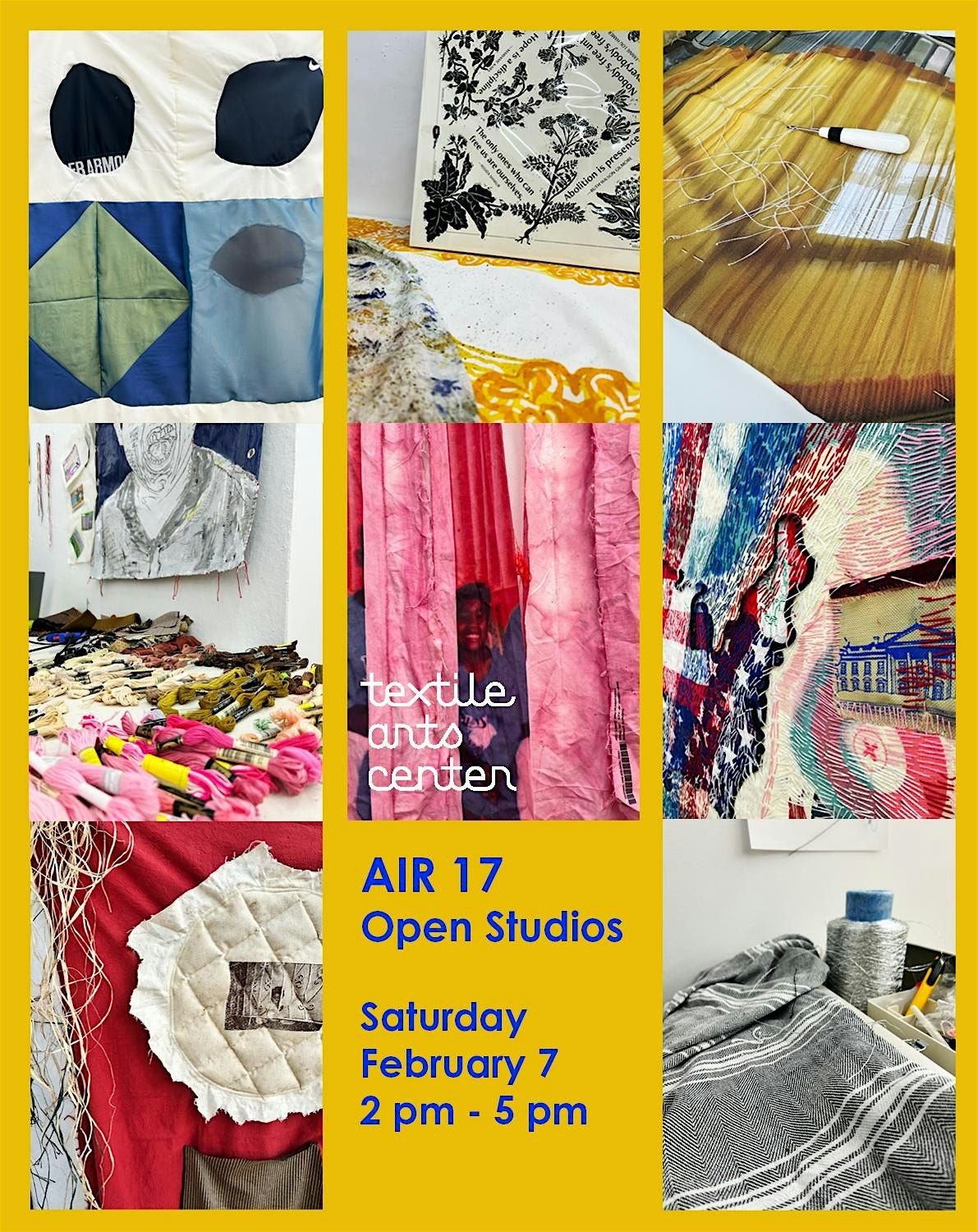 Come to Textile Arts Center (505 Carroll St, Brooklyn, NY 11215) and learn about the work of our current AIR artists. Our AIR 17 Open Studios are a chance to speak with the residents about their practice, see their processes up close, and have a peek into what they have been exploring during their introductions to different textile techniques.