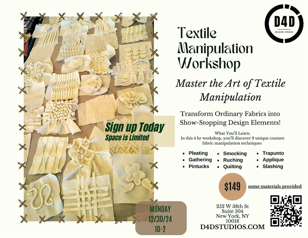About the Event:Unleash your creativity with the Textile Manipulation Workshop, a hands-on session designed to teach you the art of sculpting, folding, and enhancing fabrics. Perfect for designers, artists, and enthusiasts, this workshop will introduce you to innovative ways of working with textiles to add depth, texture, and dimension to your creations.