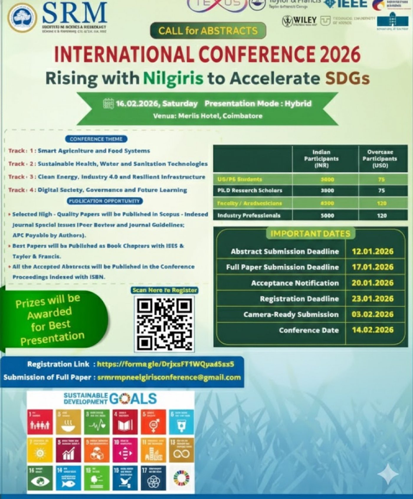 Rising with the Nilgiris to Accelerate SDGs – International Conference 2026 is a multidisciplinary global forum dedicated to advancing the United Nations Sustainable Development Goals (SDGs) through technology-enabled innovation, inclusive development, and international collaboration.