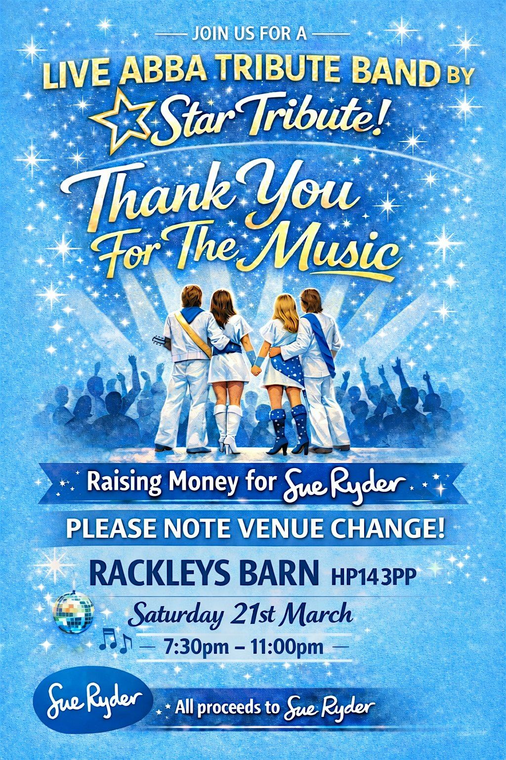 Thank You for the Music! is a special ABBA tribute night in support of Sue Ryder, bringing people together for an evening of live music, remembrance, and fundraising. Organised by Sarah Greenacre in memory of her late father, who was cared for by Sue Ryder, the event celebrates both his life and the incredible work of the charity. Guests can enjoy an ABBA tribute performance, a bar on site, and a raffle, with all proceeds helping to support Sue Ryder’s vital care services.