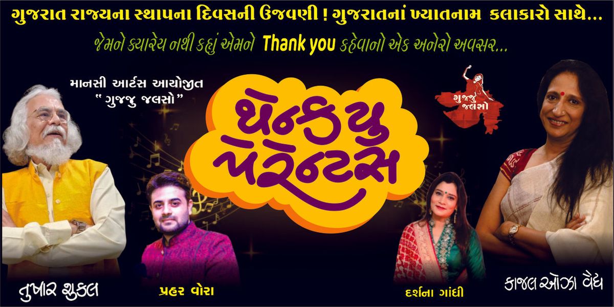 Organized on the occasion of Gujarat State Foundation Day, this special show brings together renowned artists of Gujarat for an engaging experience filled with melodious songs, emotional narratives, and light-hearted moments. The program beautifully blends music with meaningful conversations, creating a nostalgic and touching atmosphere for audiences of all ages.