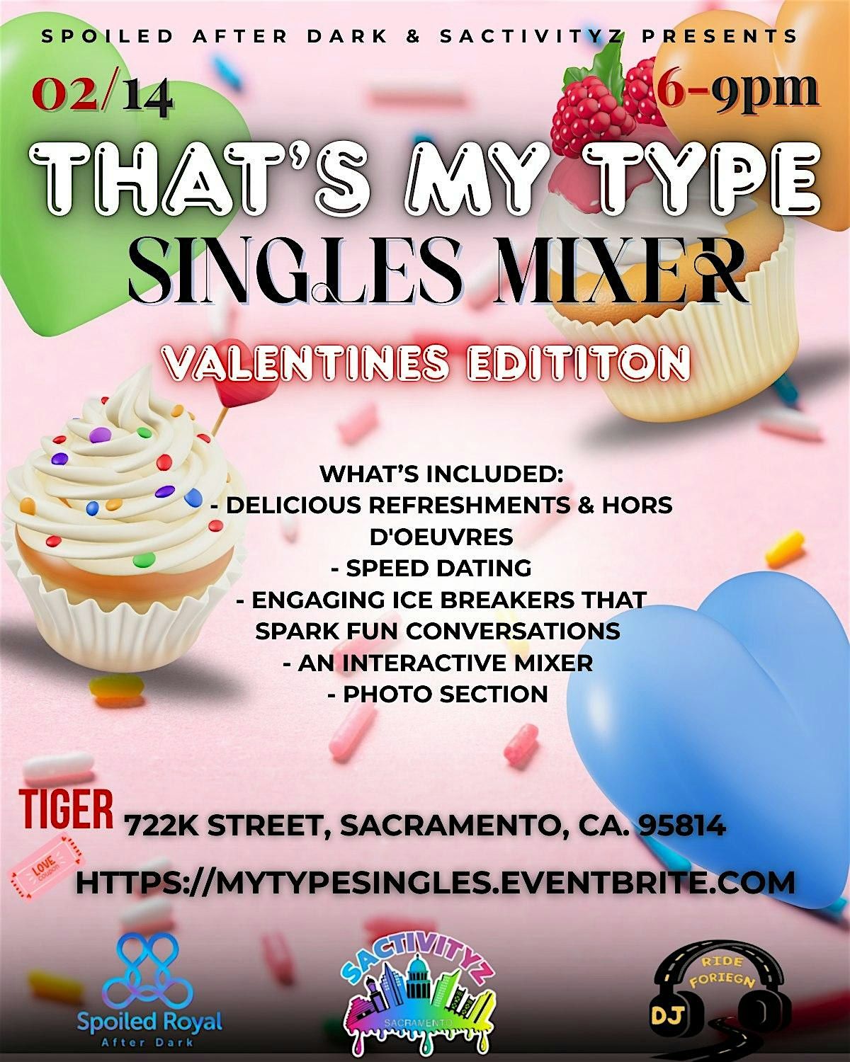 Join us for the That's My Type Singles Mixer happening on February 14th from 6:00 PM - 9:00 PM at Tiger, 722 K St, Sacramento, CA 95814.