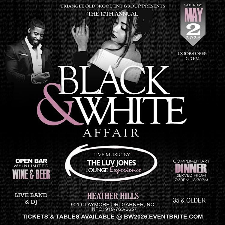 Join Triangle Old Skool Entertainment Group for an unforgettable night at the Heather Hills Club! Join us on May 2, 2026 at 7:00 PM (Eastern Time) for the 10th Annual Grown Folks Black & White Affair. Dress to impress in your best black and white and enjoy great vibes, music, and company. This in-person event is all about celebrating style and good times with friends old and new. Don’t miss out on this classy, fun evening!