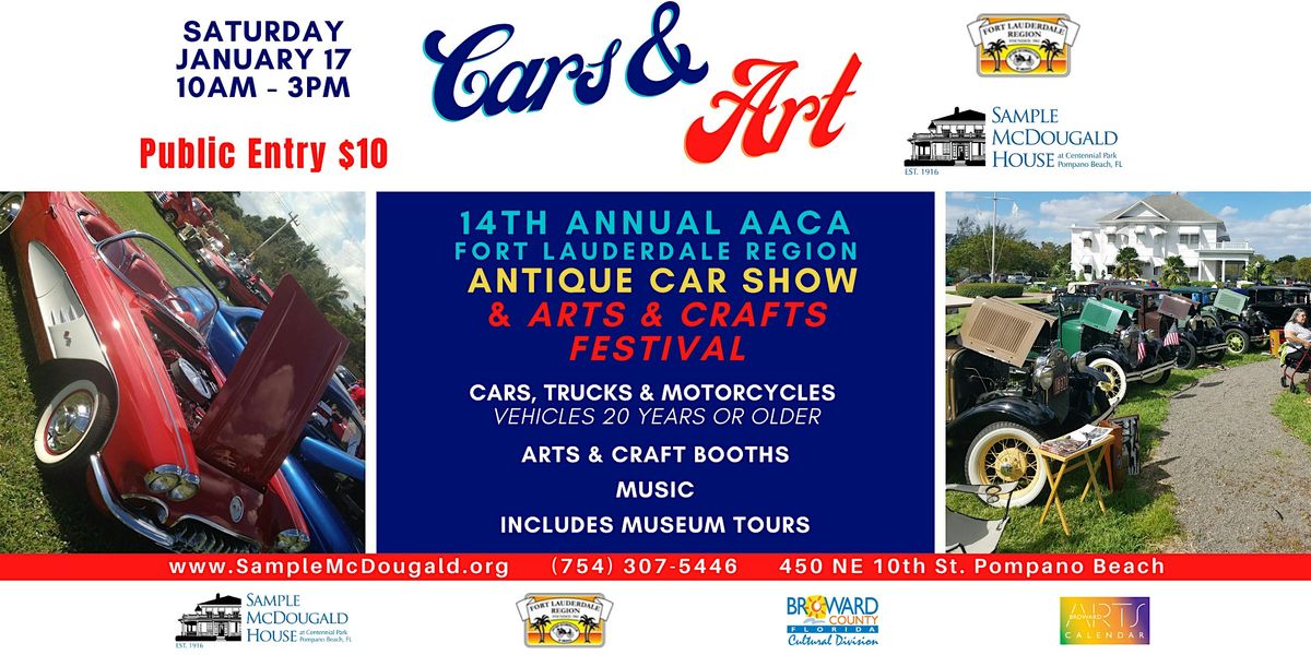 Join us for this fabulous event on Saturday January 17th! Cars, trucks, and motorcycles (vehicles 20 years or older) will be on display, along with arts and crafts booths and music. Admission includes museum tours. Public entry is $10. The event will be held at Sample-McDougald House, 450 NE 10th St., Pompano Beach. For questions call (754) 307-5446.