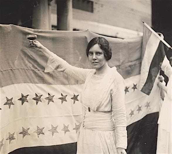 Photo: Alice Paul raises a glass in front of a banner to celebrate the ratification of the 19th Amendment, August 26, 1920. National Woman's Party Collection, Library of Congress