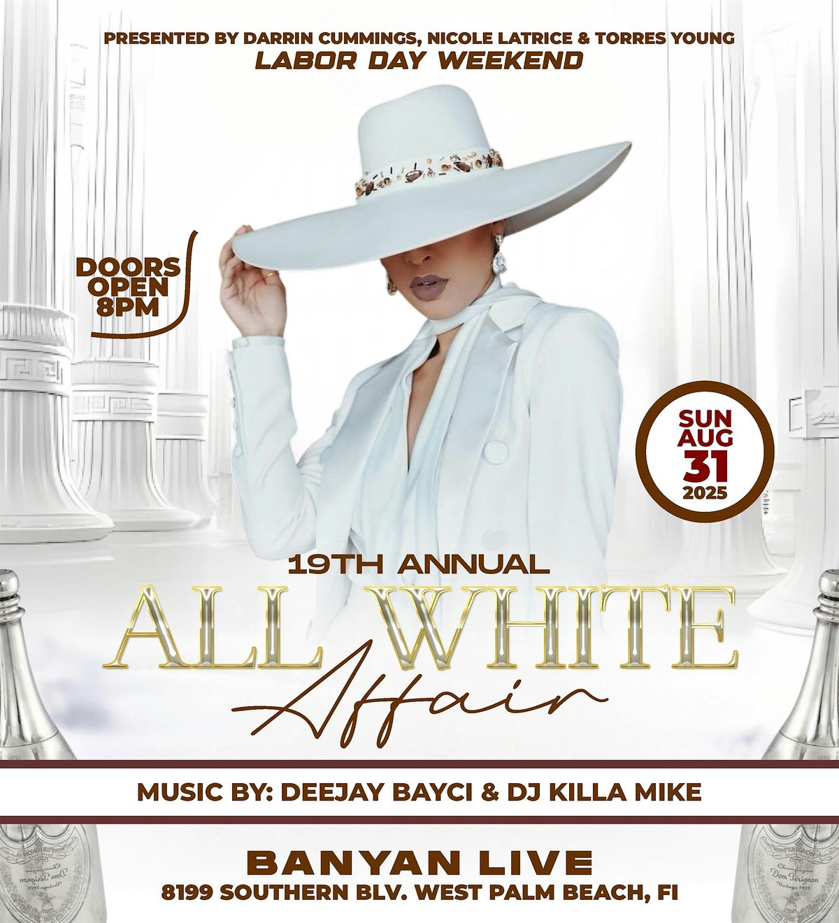 The longest-running 19th Annual All White Affair is making its return this Labor Day Weekend, on Sunday, August 31st! Get ready for a night of unforgettable vibes featuring music by DJ Bayci and DJ Killa Mike, spinning the best in R&B, Hip-Hop, Old School, and Reggae. Don your freshest all-white attire and celebrate the summer’s hottest tradition in style! Perfect for partygoers who love great music and legendary vibes at Banyan Live. 8199 Southern Blvd West Palm beach, FL. RSVP today to secure your seating because tables will go fast!