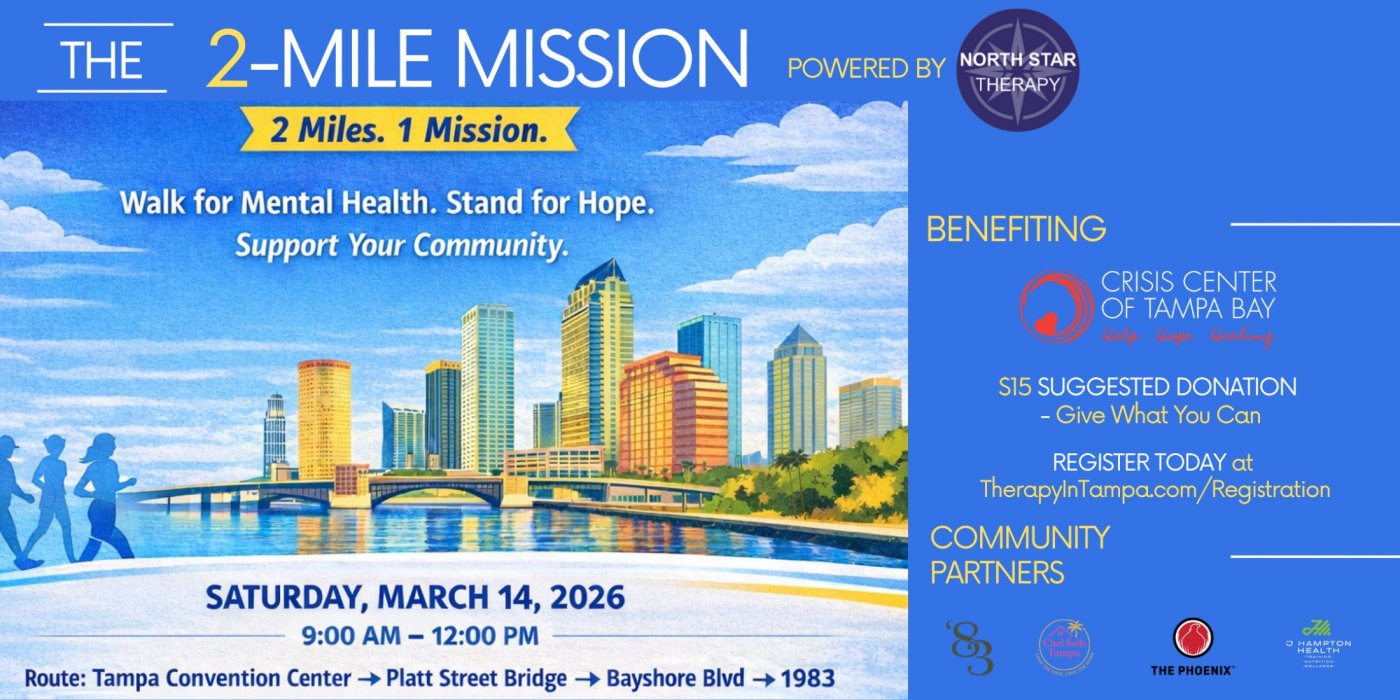 Join The 2-Mile Mission powered by North Star Therapy, a community charity walk to raise awareness for mental health and support the life-saving work of the Crisis Center of Tampa Bay. A suggested $15 registration donation helps fund critical care and support services. After the walk, join us at 1983 for refreshments and connection. Everyone is welcome!