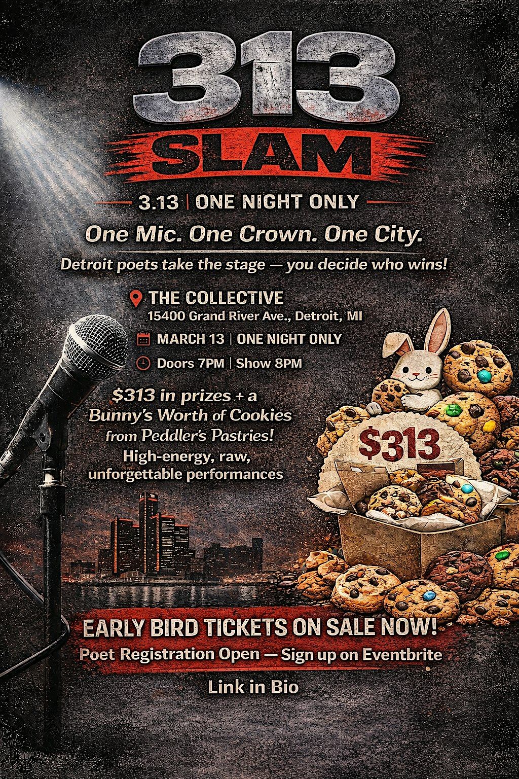 313 SLAM is back for one unforgettable night of raw, high-energy poetry. Local poets will take the stage to compete for $313 in prizes and a Bunny’s Worth of Cookies from Peddler’s Pastries. You, the audience, will help decide who rises to the top.