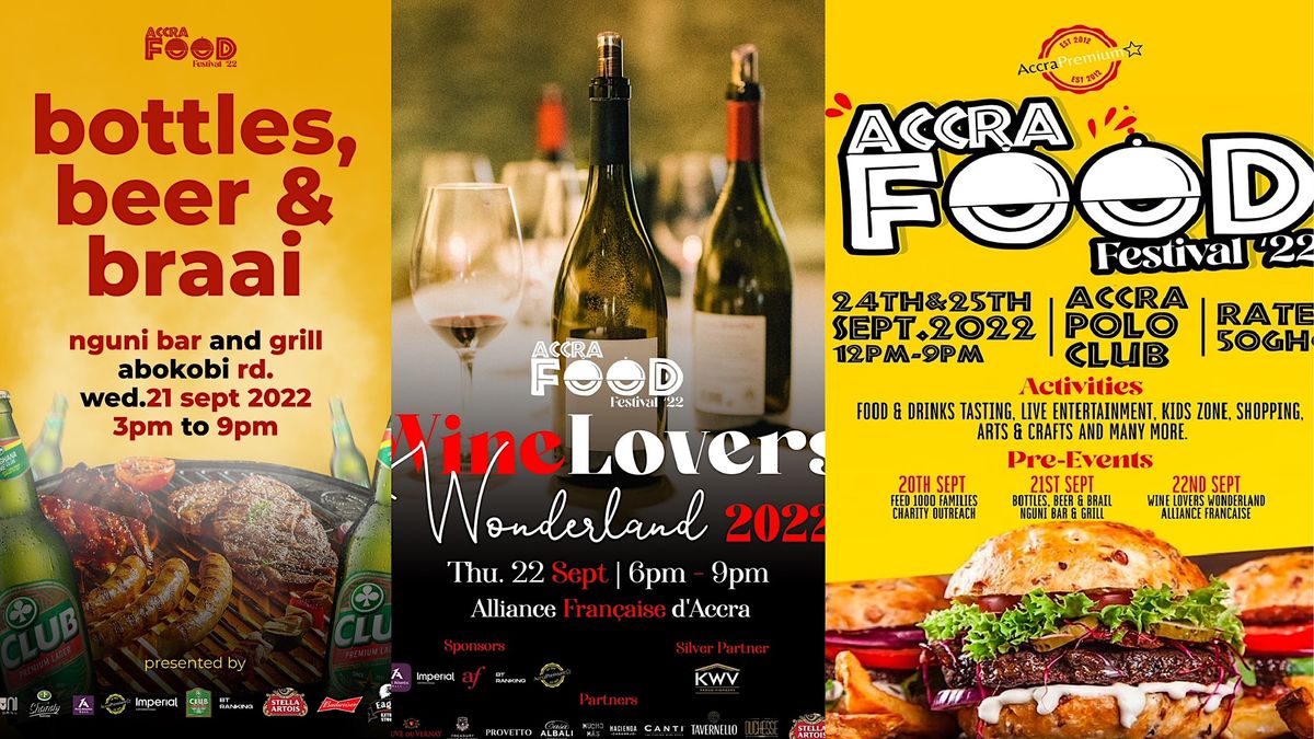 The 9th Accra Food Festival - Saturday 24 - Sunday 25 September, 2022, Accra Polo Club Bring the entire family out and experience the 9th Accra Food Festival. Sip, Shop, & Sample from the best Food, Drink, & Lifestyle brands available in Accra. Entry is 50 GHS per person and children under 5 are free.