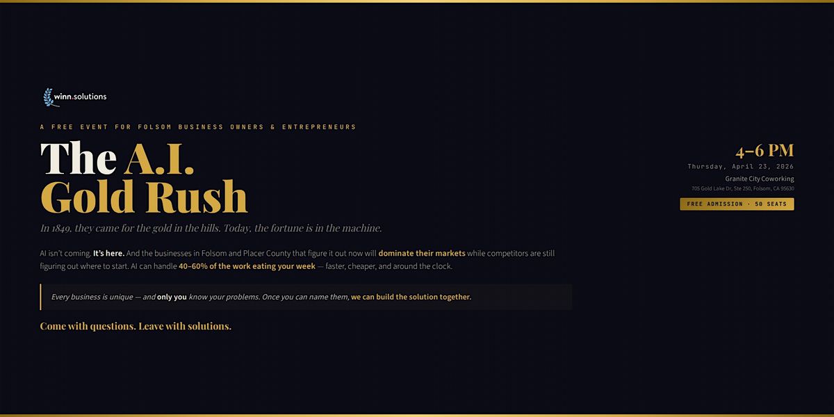 Join Jarred Winn at Granite City Workspaces in Folsom for a free evening where we cut through the noise and show you what AI can do for your business. Live demos of AI agents handling emails, proposals, data analysis, outreach, and more. No jargon. No theory. Just results.