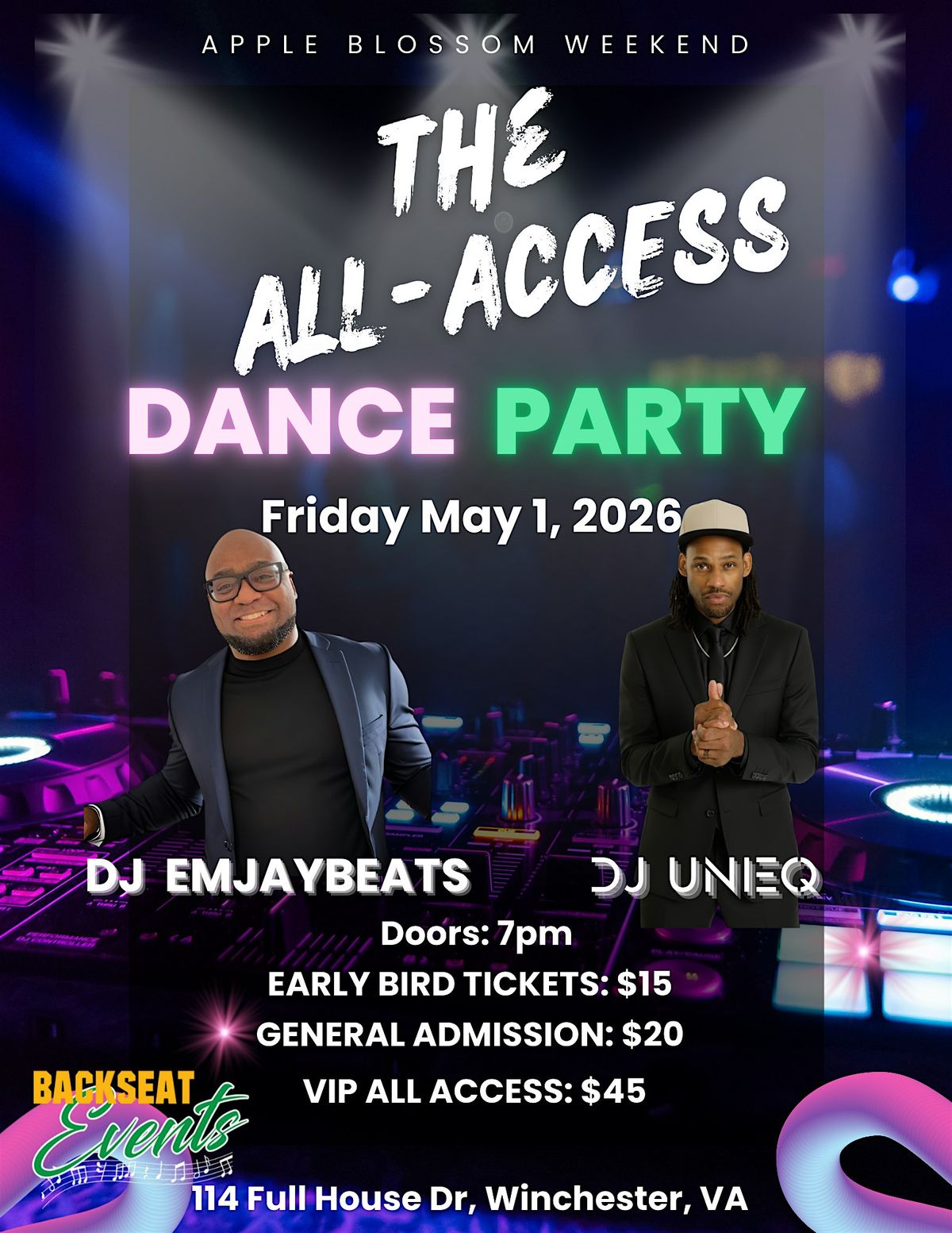 THE ALL ACCESS DANCE PARTY is taking over Apple Blossom Festival Weekend — one night, one massive room, nonstop energy.