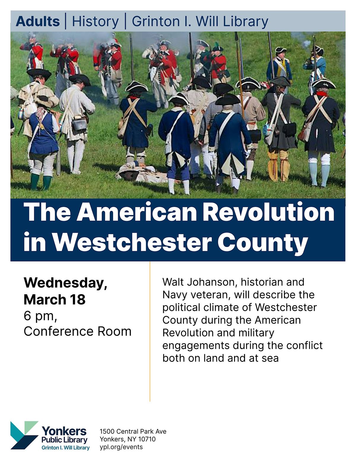 Walt Johanson, historian and Navy veteran, will describe the American Revolution as described by three American generals and according to Washington Irving. He will talk about the political climate of Westchester County during the American Revolution and military engagements in the region both on land and at sea.