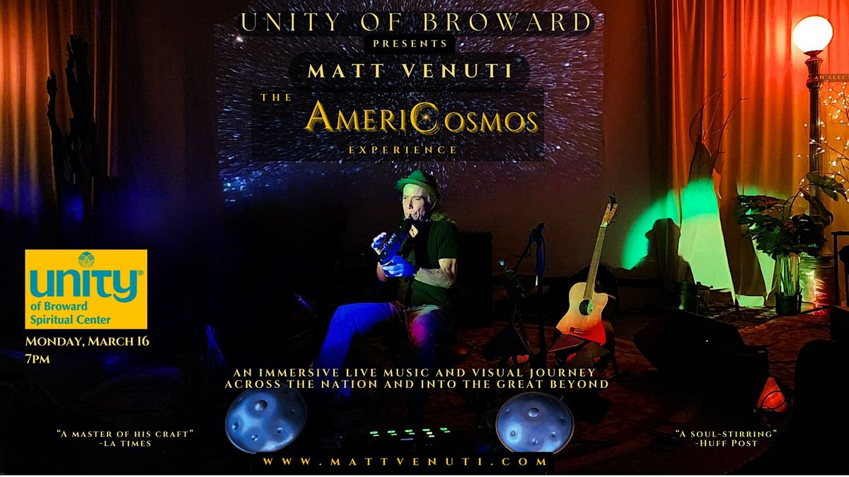 Step beyond the familiar in this amazing immersive experience with national touring artist and award-winning composer Matt Venuti--The AmeriCosmos Experience, a 75-minute immersive multi-sensory event coming to the Unity of Broward on Monday, March 16.