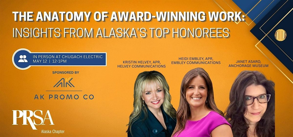 The program will focus on the PRSA Alaska Chapter Aurora Awards, Awards of Excellence, and Individual Awards, with additional insights into national opportunities such as the PRSA Anvils. Whether you’re submitting for the first time or refining your award‑writing skills, you’ll walk away with practical guidance you can apply immediately.