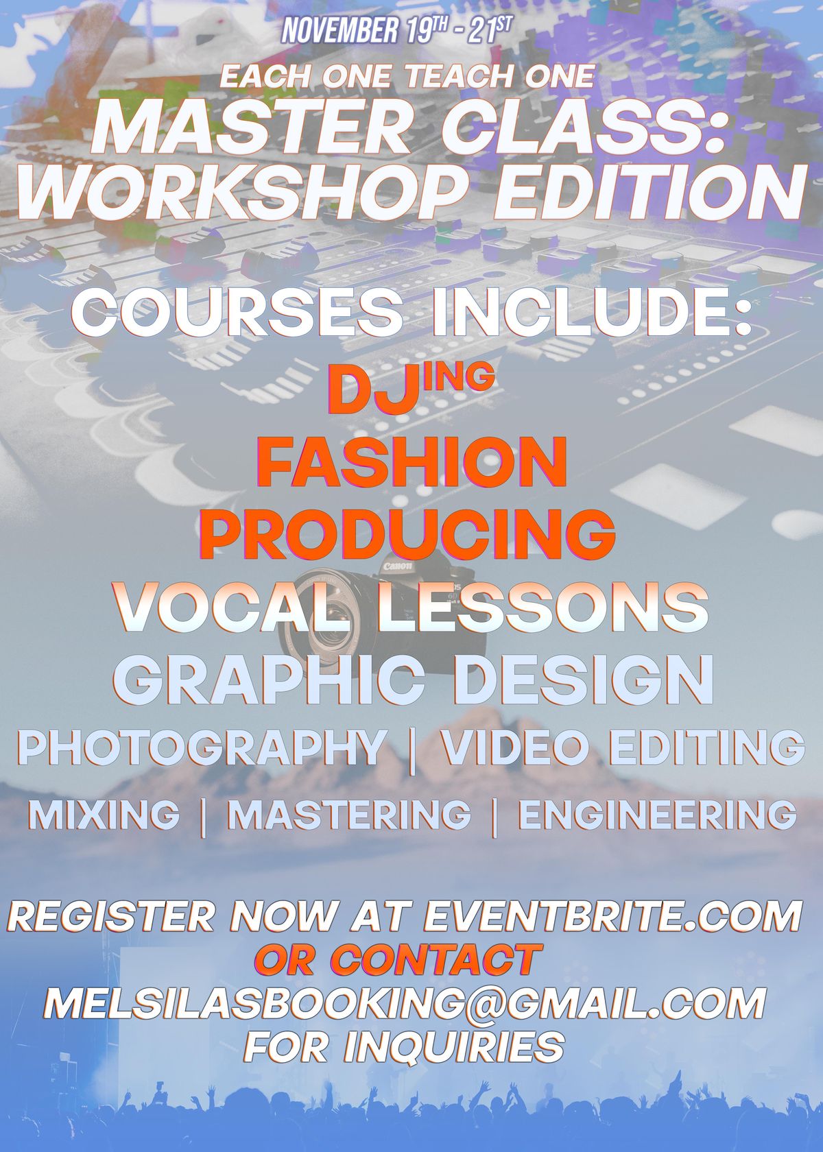Workshop & Master Class Featuring: Vocal, Engineering, Producing, Videography, Djing, Fashion & Graphic Design. *High Value Free Giveaways!*About this Event
