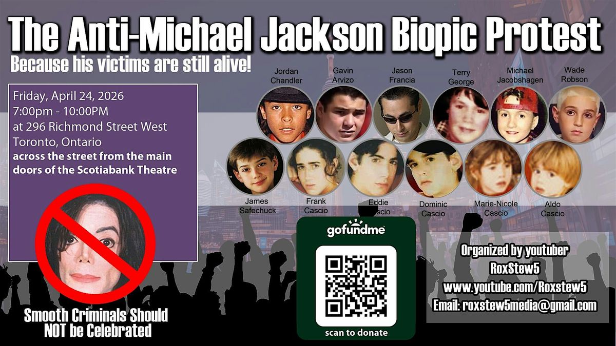 Join us in person to protest against the showing of the Lionsgate film entitled "Michael" a biographical movie about Michael Jackson. This protest goes beyond just Michael Jackson, but is an outcry against systematic child trafficking and child sexual abuse that has been enabled and facilitated for decades in the entertainment industry by multi-billion dollar corporations like the Jackson Estate, which due to its immense resources has used bullying tactics to silence current survivors of Michael Jackson's crimes.