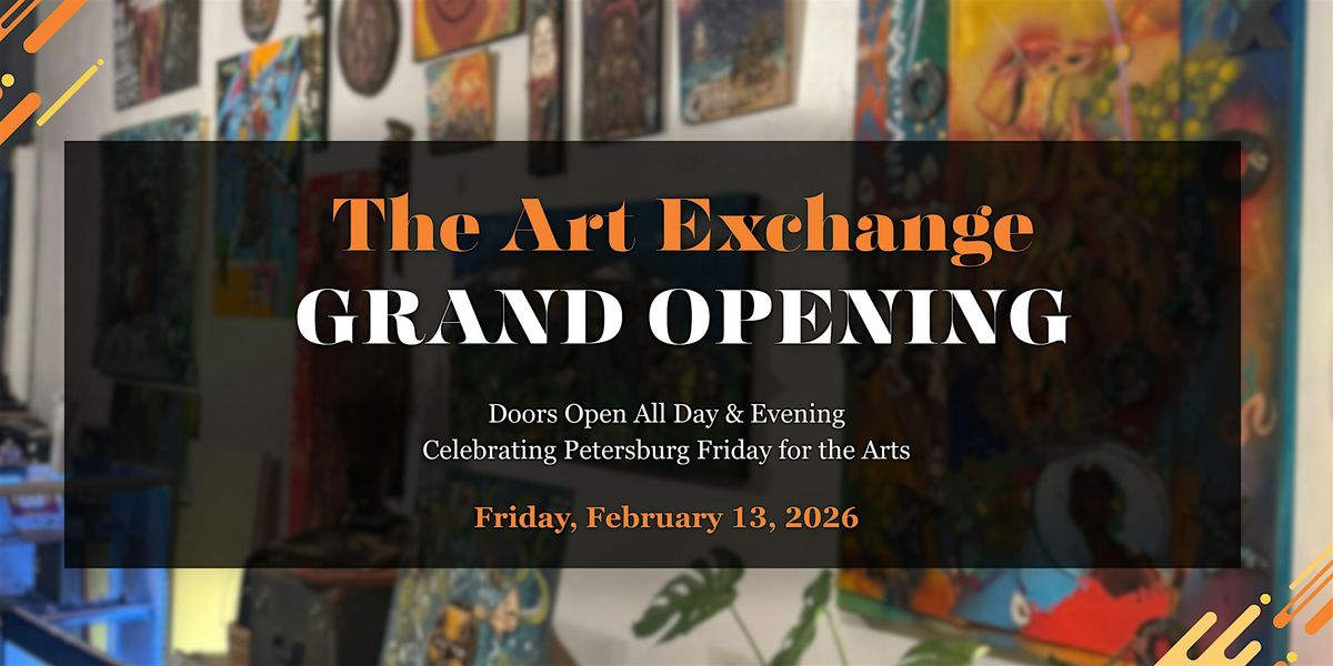 Join us for the grand opening of The Art Exchange, a new creative destination in the heart of Petersburg. Explore original artwork, curated exhibitions, and a vibrant space designed to connect artists, collectors, and the community.