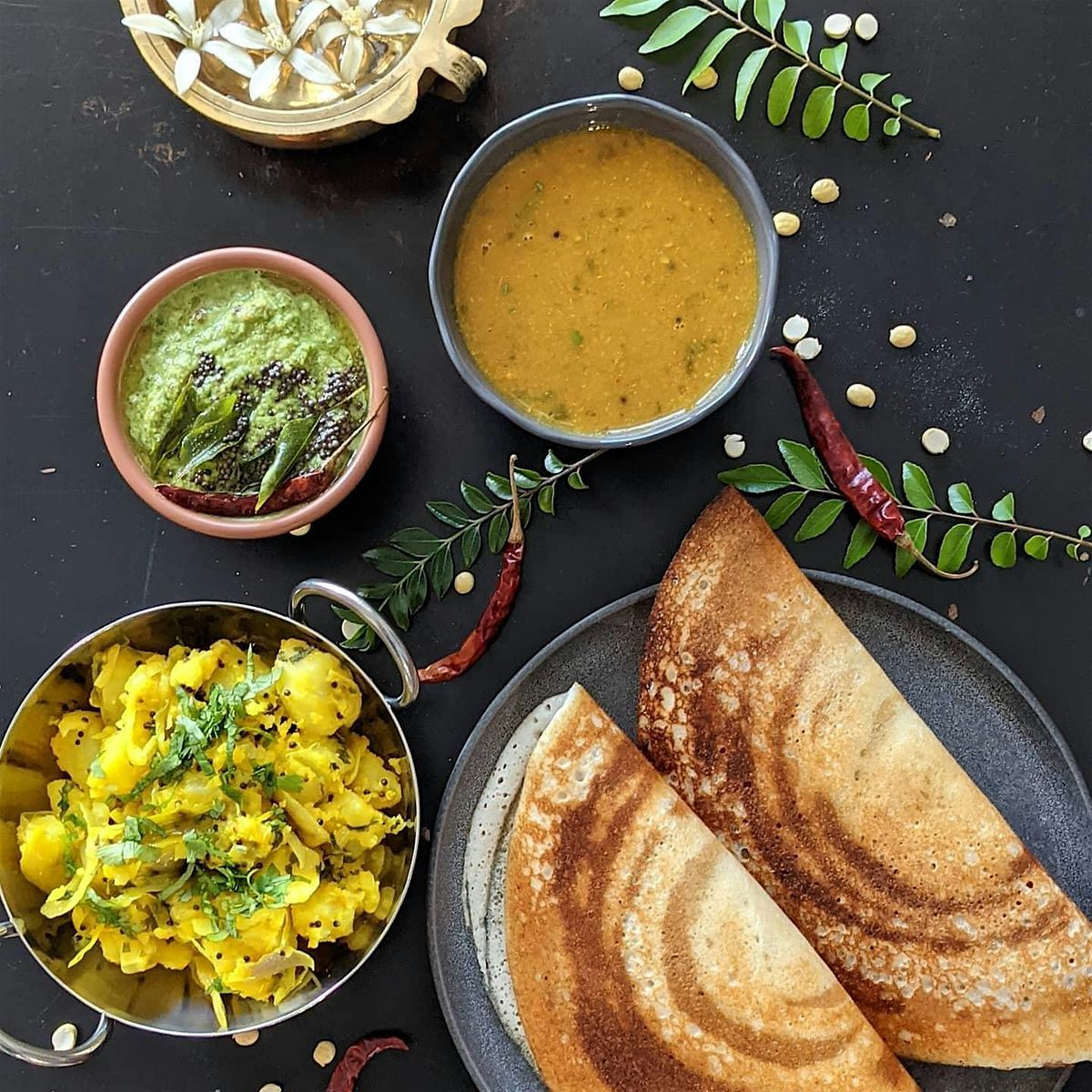 - Smashed Potato Filling – a classic dosa pairing of gently spiced potatoes finished with mustard seeds and aromatics