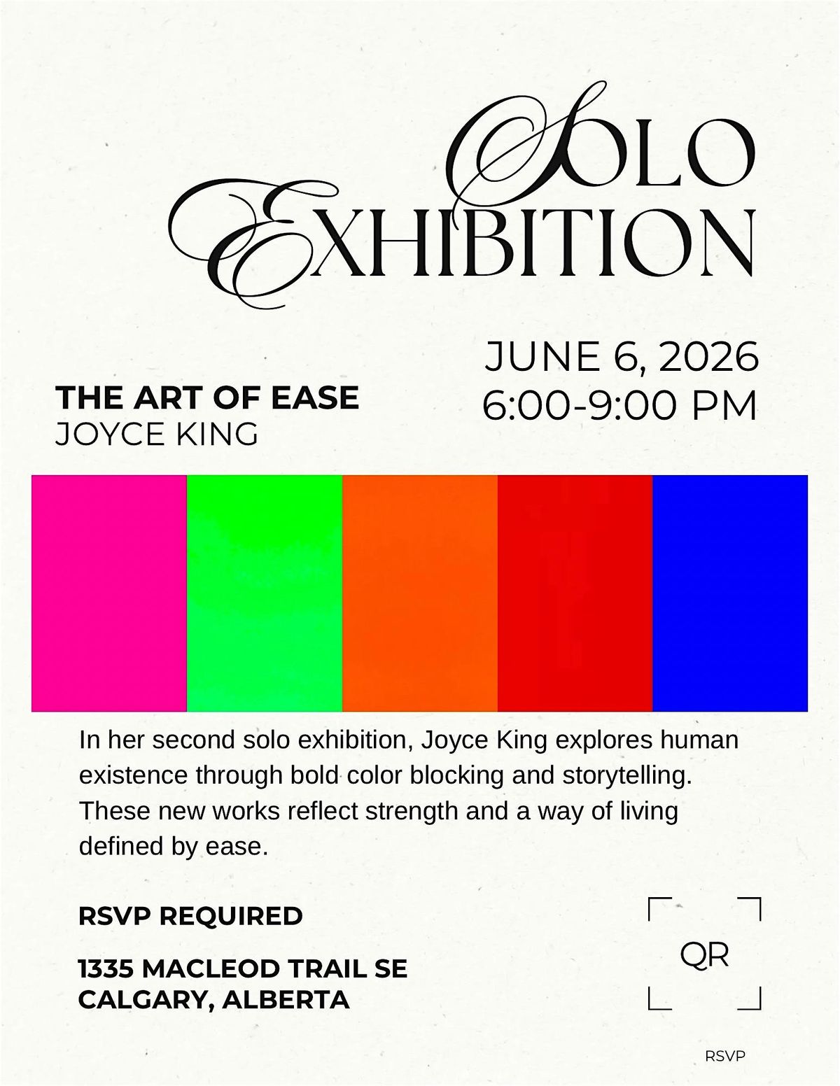 A solo exhibition featuring bold works, curated drinks, light catering, and live music. RSVP required.