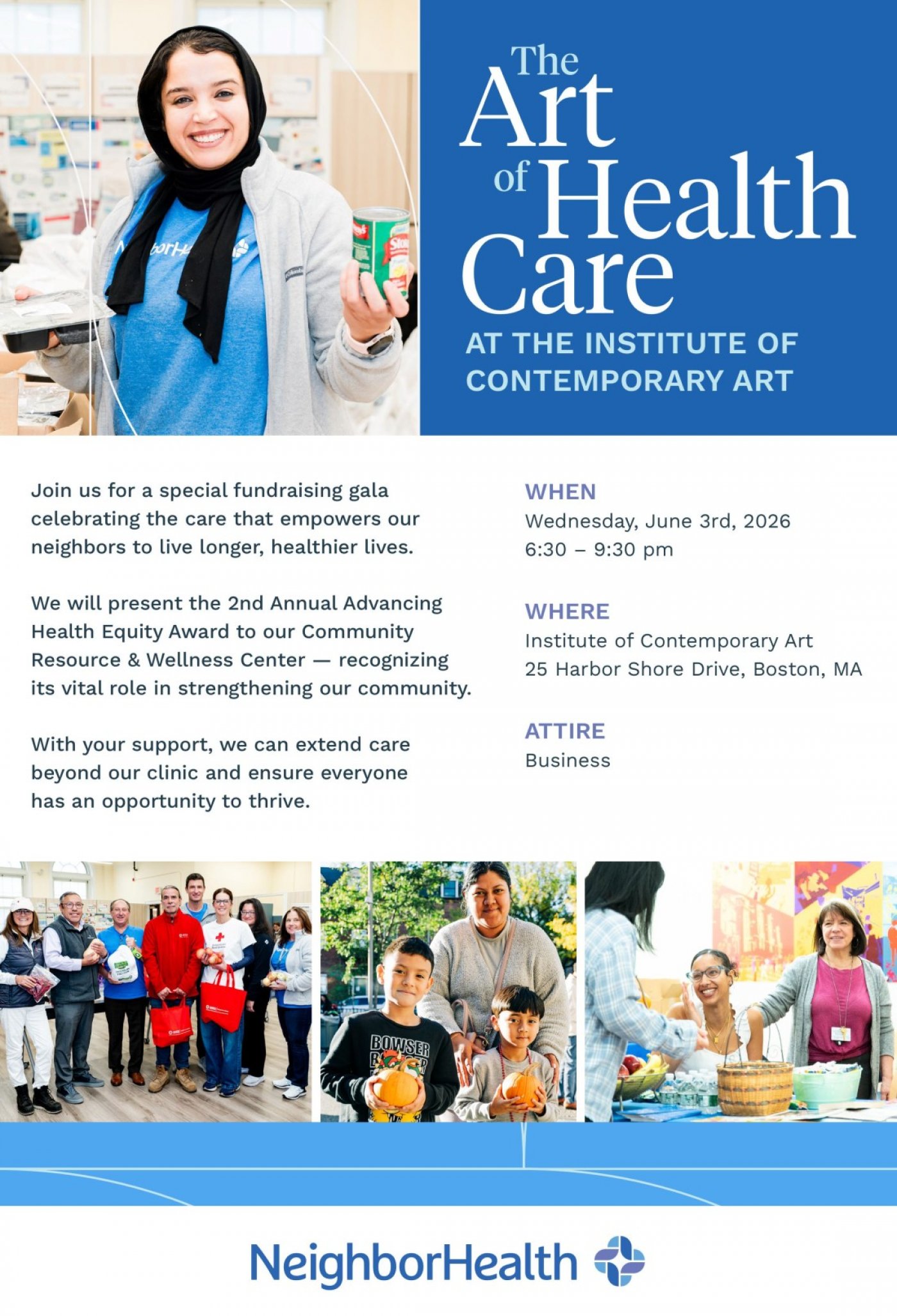 Join us for The Art of Healthcare, a special fundraising gala celebrating NeighborHealth’s commitment to delivering the care our neighbors need to live longer, healthier lives together. This annual event makes it possible for us to provide health care beyond the clinic to everyone who needs it.