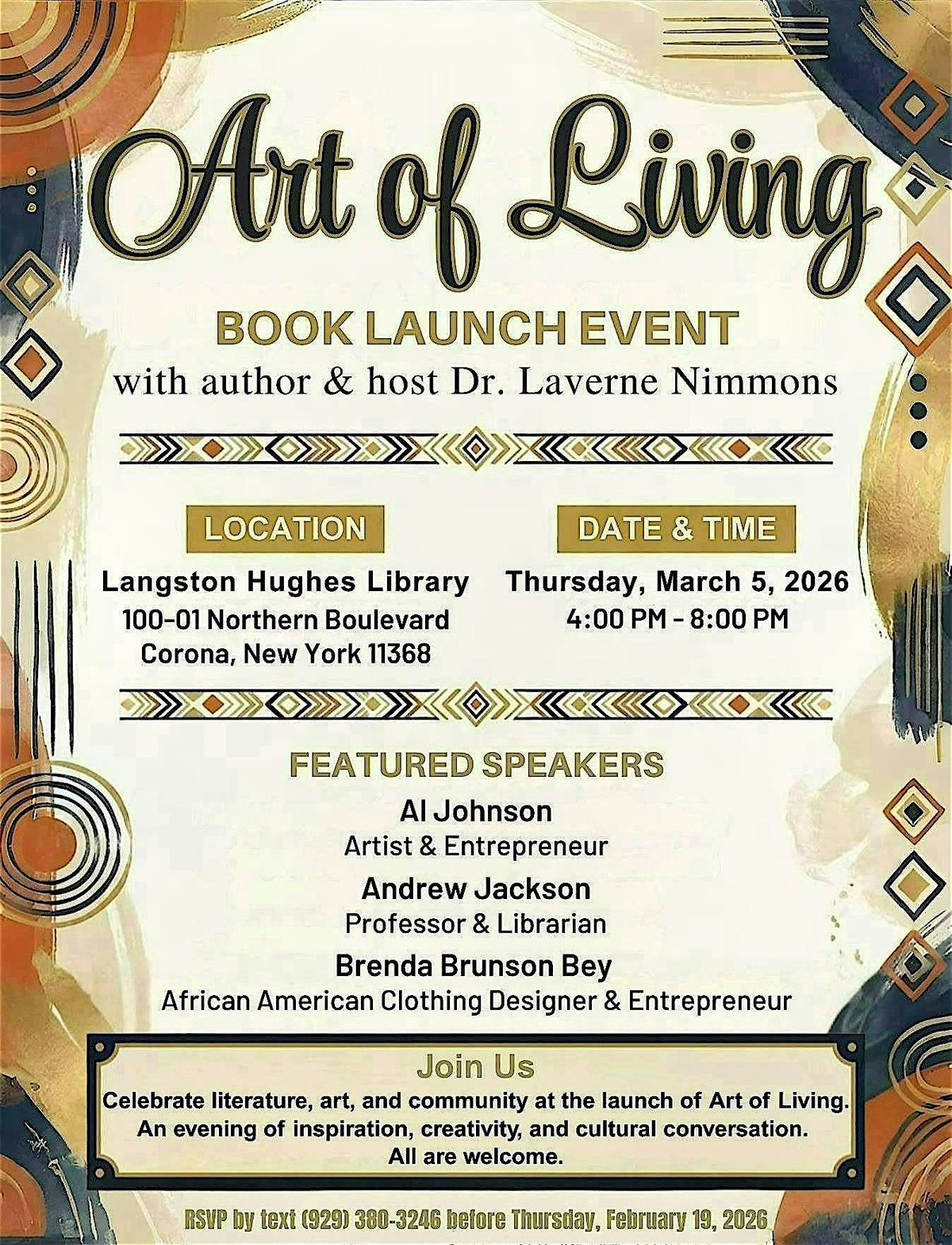 Experience the art, the words, and the wisdom! Join Dr. Laverne Nimmons for the book launch of Art of Living—a celebration of creativity, culture, and community—at the Langston Hughes Community Library and Cultural Center.