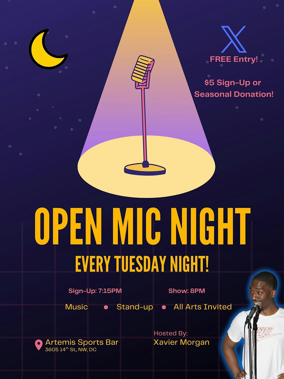 DC’s longest-running open mic! Free entry. Hosted by Xavier Morgan. Sounds by DJ Haze. Every Tuesday! All arts invited!