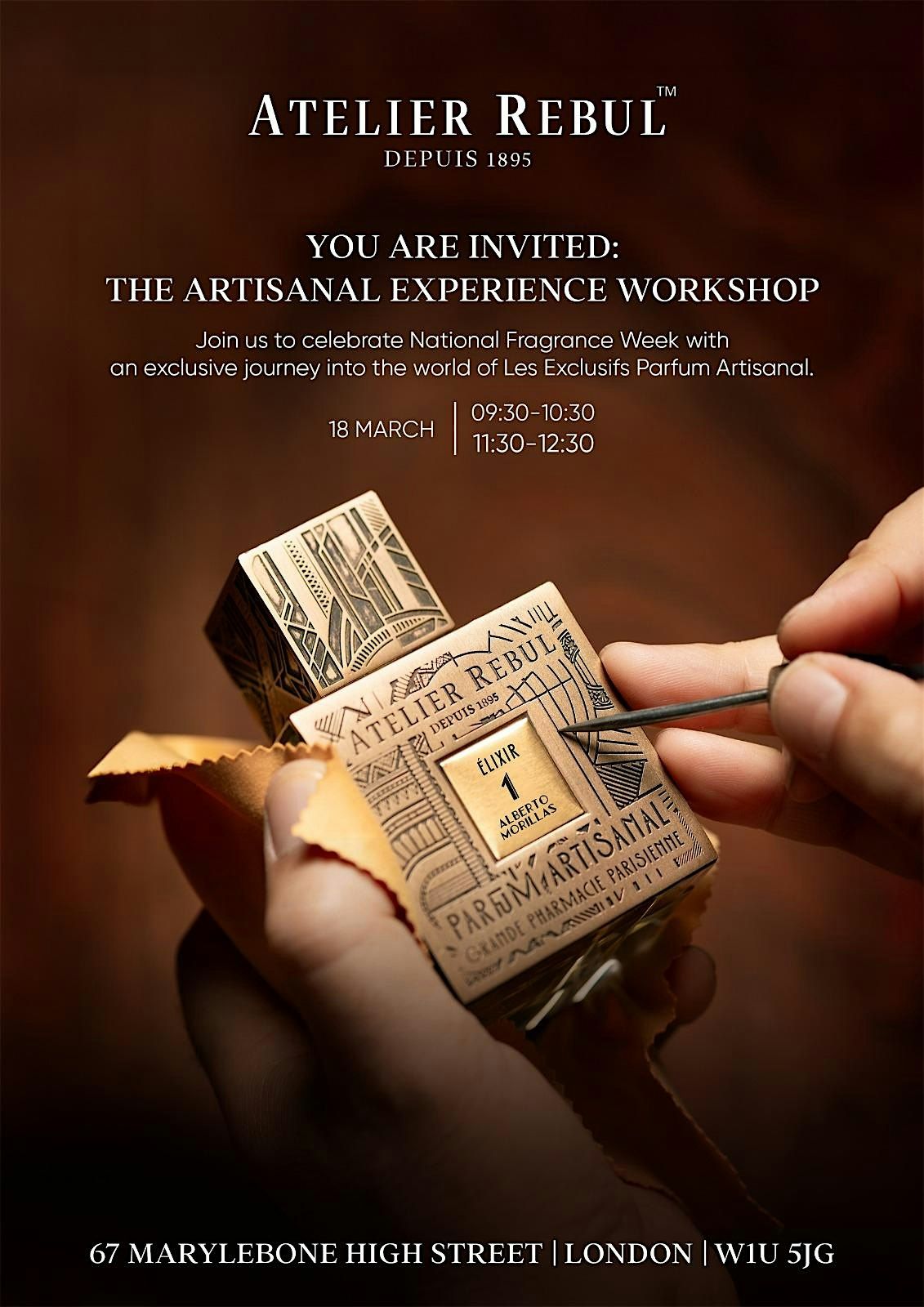A personalised session to discover the craftmanship behind a unique scent and learn how to build a fragrance profile. Refreshments will be provided and your gift is your own 100ml Perfume, created personally for you, by you ! We look forward to welcoming you into the world of Atelier Rebul.