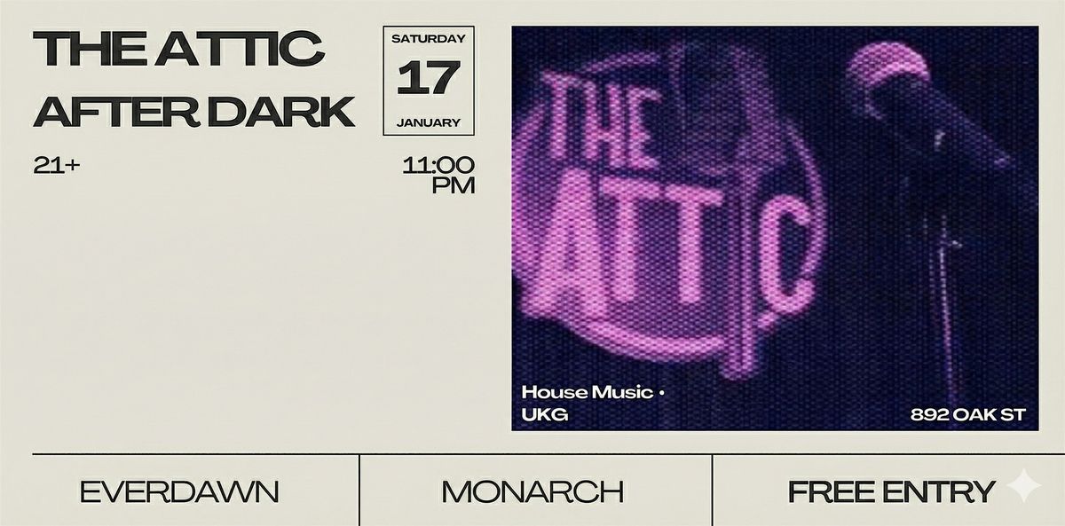 Late night usually means just a bar or a club. Weโre changing the game. This January 10th, 2026 Attic After Dark presents EVERDAWN x Monarchโa collision of vibes you wonโt find anywhere else in the city. ๐นโจ๐ง