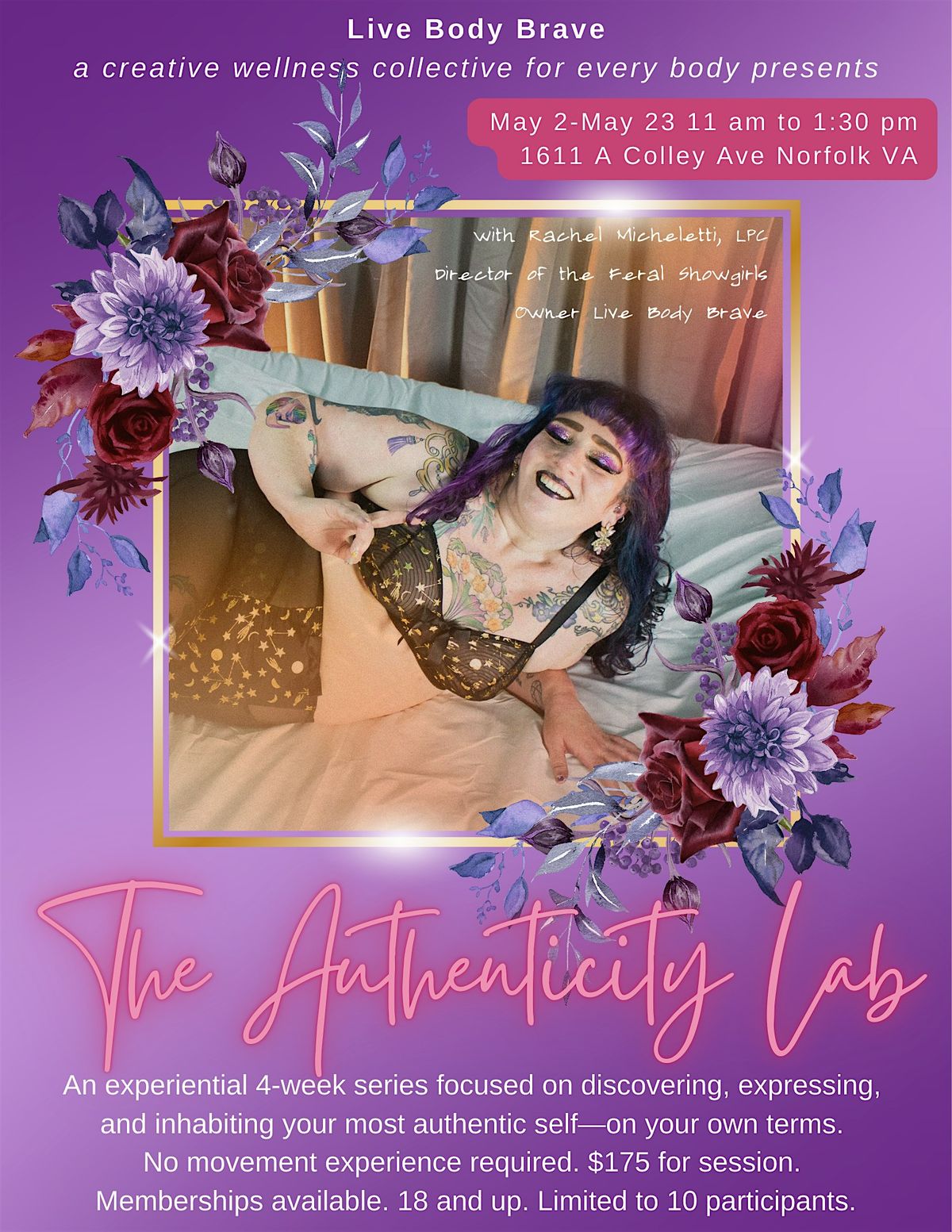 The Authenticity Lab is a 4-week experiential series using movement, music, performance-based exploration, and mental health–informed practices to help participants connect more deeply with their personal authenticity.