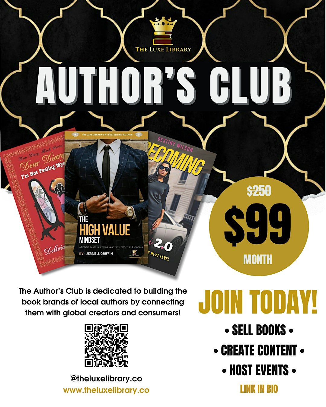 Welcome to the Authors Club event at The Luxe Library: Bookstore & Lounge! Join us for an exciting gathering of book lovers, writers, and avid readers. This in-person event will be a fantastic opportunity to meet and connect with fellow authors, share your passion for literature, and engage in lively discussions about your favorite books. Don't miss out on this unique chance to immerse yourself in a world of words and creativity. See you there!