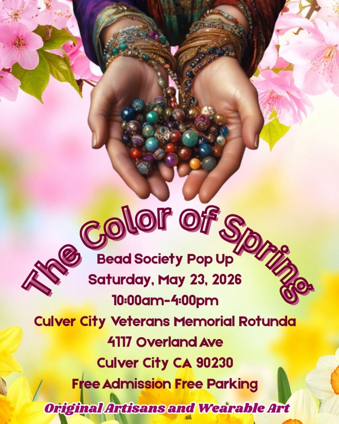 Enjoy the beautiful vibes of local artists showcasing their fabulous handmade jewelry and wearable art! A day of experiencing creativity at it's finest. The Color Of Spring, The Bead Society is hosting this event on May 23rd, at the Culver City Vet Memorial, at 10am until 4pm. Free Admission and free Parking. There will be various styles and statements, many too choose from, all will make great gifts or treats for one self!