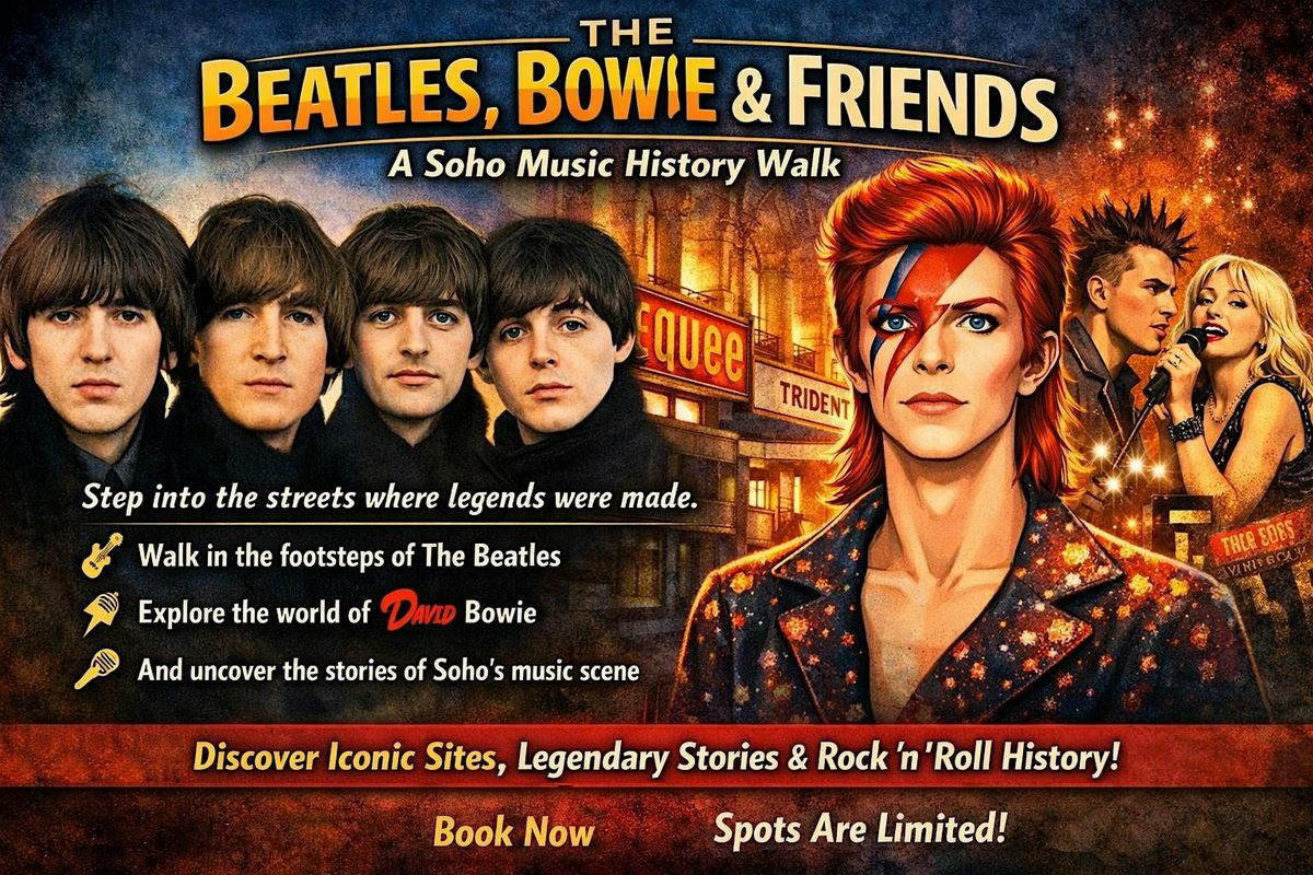 Welcome to The Beatles, Bowie & Friends! | Rock Legends of Soho Walking Tour! Join us on a journey through the iconic streets of Soho as we explore the musical history of this vibrant neighborhood. Walk in the footsteps of legends like The Beatles, David Bowie, and other rock icons who have left their mark on the area.