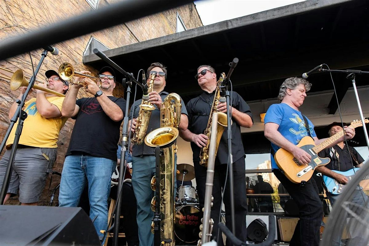 THE BELFAST COWBOYS is a nine-piece, horn-driven band from Minneapolis that specializes in the music of Van Morrison along with their own originals, mixing rock, blues, roots and soul sounds. Led by veteran songwriter and guitarist Terry Walsh and powered by a four-piece horn section, the Cowboys have flourished in the renowned Minnesota music scene, consistently packing houses and wowing crowds since 2002.