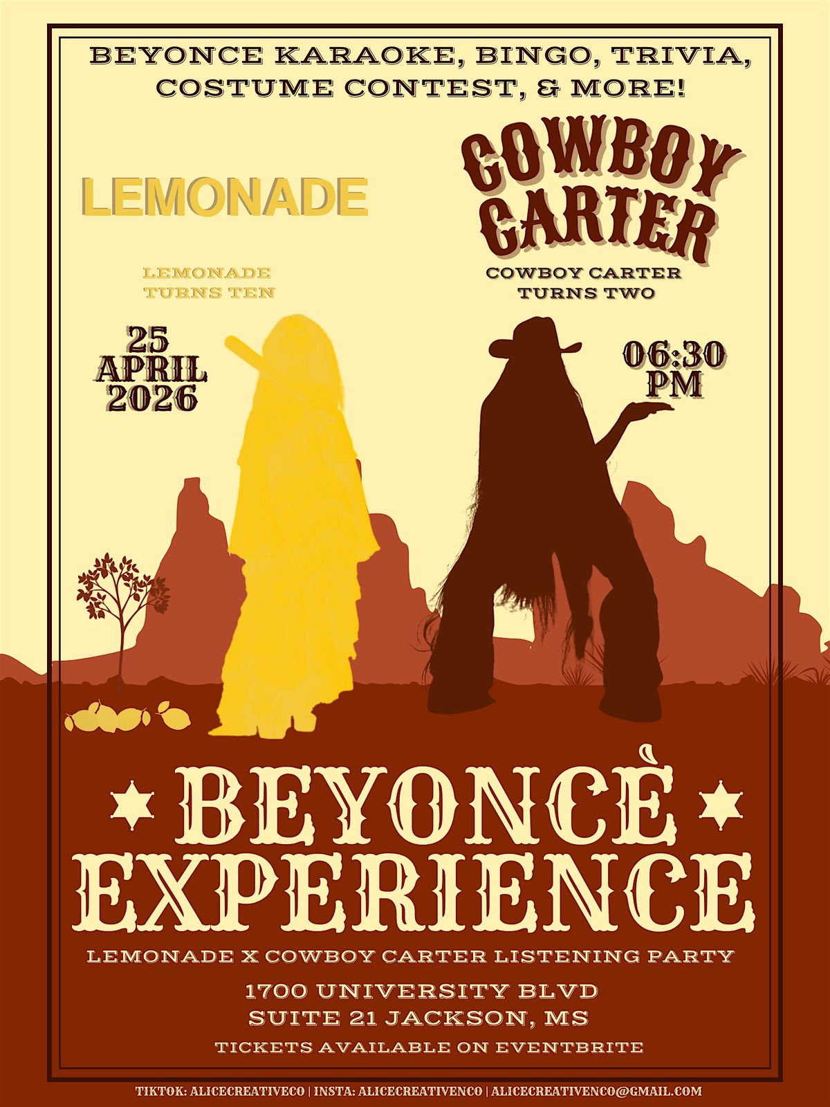 From the emotion of Lemonade to the southern energy of Cowboy Carter, this immersive event brings Beyoncé’s eras to life in one unforgettable night. Let's celebrate the anniversary of Lemonade and Cowboy Carter together!